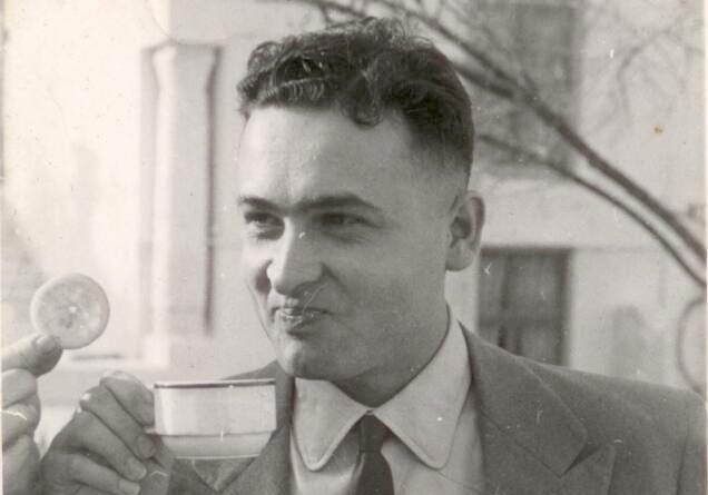 The remnants of their life in North Africa are scattered throughout my aunts’ homes and my mother’s; the engraved copper tea set, the worn tapestry of an Arab family in the desert making couscous, the soft leather poofs, carefully preserved photographs of my aunts at the beach, friends dressed in Arab garb, my father drinking tea on what was then Avenue Jules Ferry.